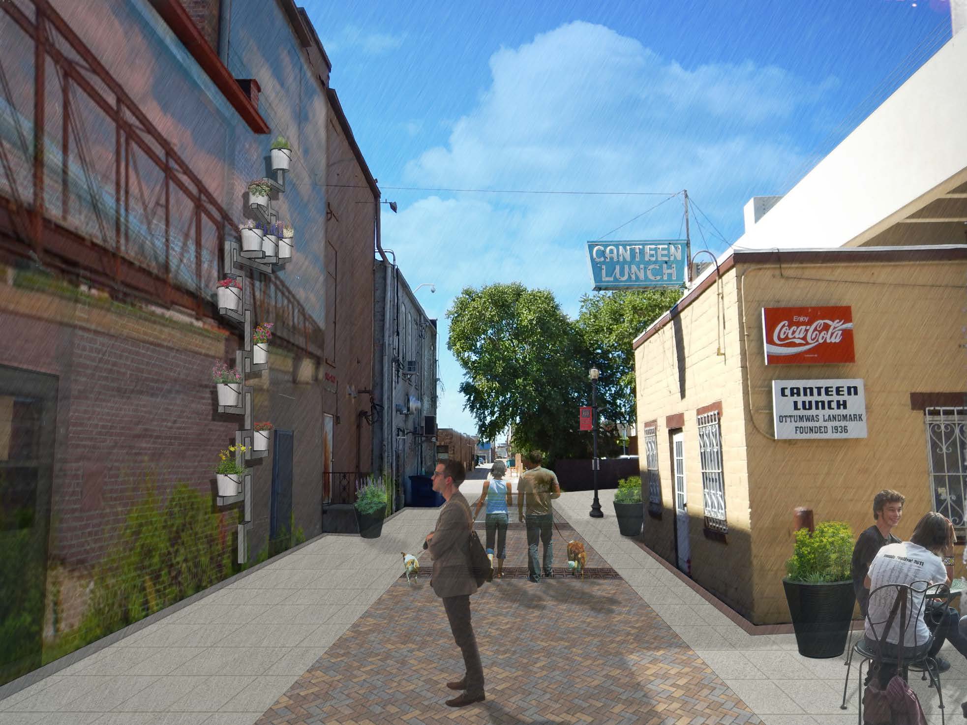This is actually Phase II of the alley project. Phase I included renovation of the open space between buildings that links Main Street to Canteen Alley. Phase I was completed this winter. This renovation included new pavers and the addition of greenscape elements like trees and ornamental grasses to the space. Principal Financial Group was a funding partner of Phase I which is located near their Ottumwa office.