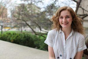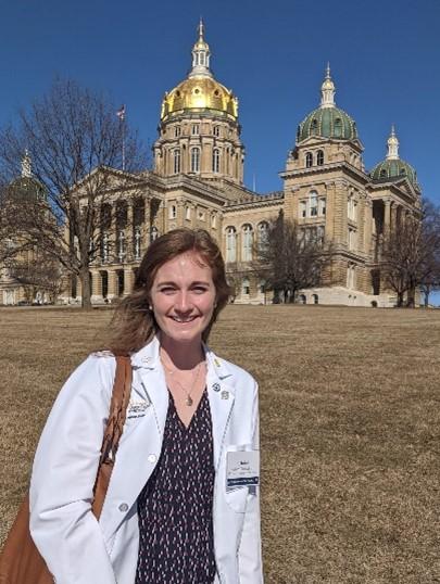 Claire Carmichael in front of the Iowa Capitol building.