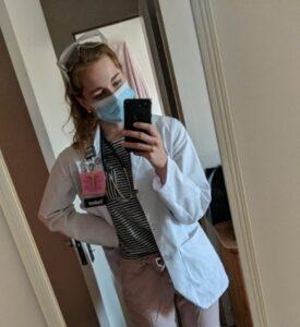 Claire Carmichael taking a photo of herself in her white coat and a mask