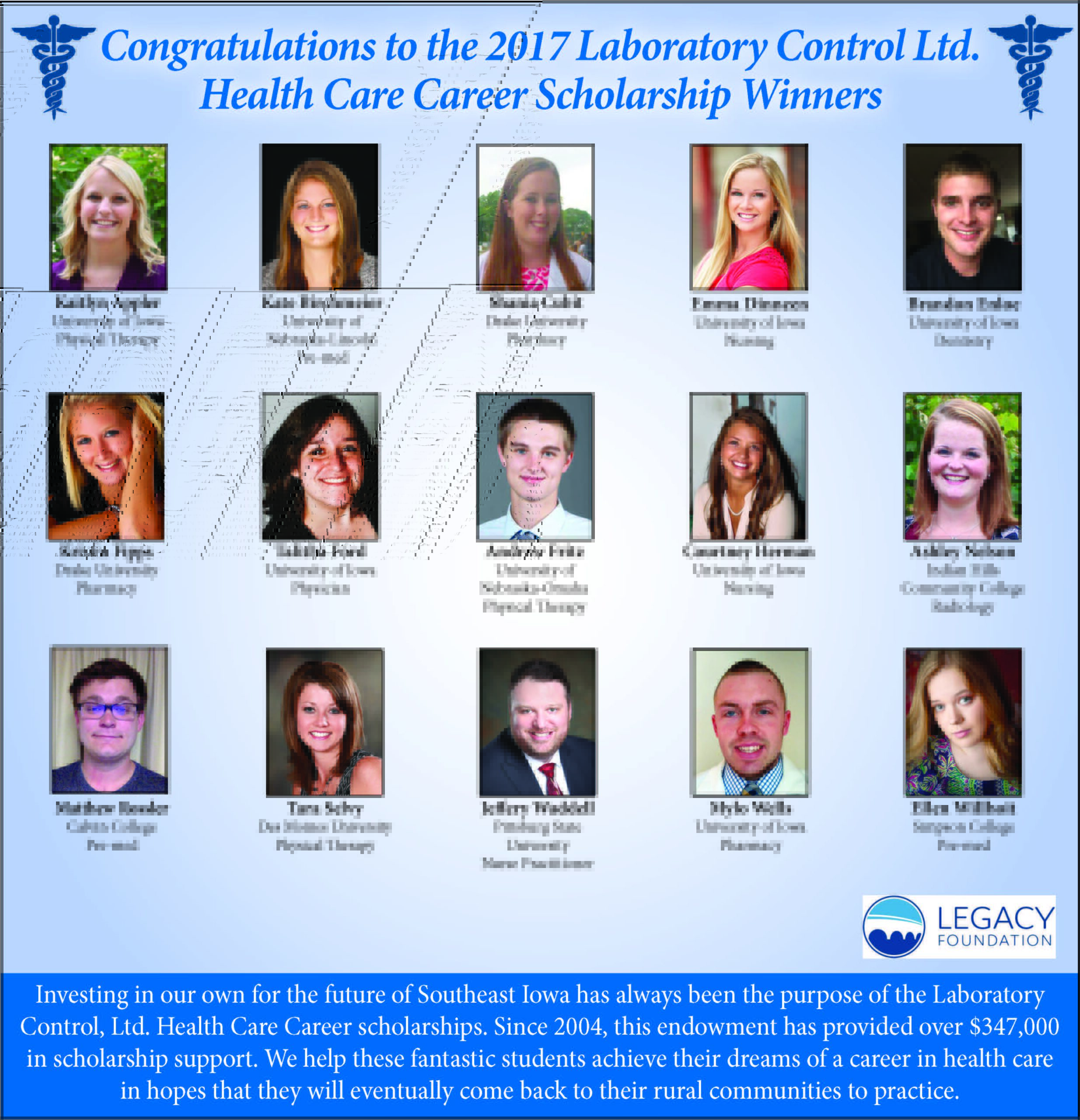 We are pleased to announce the recipients of the Laboratory Control Ltd. Health Career Scholarship for the 2017-2018 school year. Since 2004, the Laboratory Control Limited Endowment has provided over $347,000 in scholarships to students from 31 different communities in southeast Iowa.