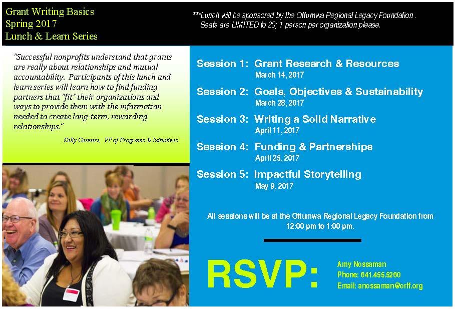 As part of the Foundation’s Capacity Program, a new lunch & learn series is now available for grantees wishing to develop more effective skills in securing grants. The series begins with discussing ways to search for and find appropriate funding partners. Subsequent sessions focus on putting together the various elements of a grant application that will enable nonprofits to create a compelling and thoughtful case for funding support. The final session teaches participants how to report back to funders (and to the community) about the work that they are doing in both a qualitative and quantitative way. Nonprofits interested in reserving their spot can email Amy Nossaman or call 641.455.5260. Lunch will be provided free of charge but seating is limited to 20 so don’t delay – the first session will be held March 14, 2017.